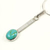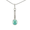 This turquoise pendant is from Jack Boglioli’s Bound Bar Collection. The stone is set in fine silver. The bar portion of the pendant is bound with fine silver that has been soldered or fused in place, so it will never come undone. The piece is finished with a bright polish.