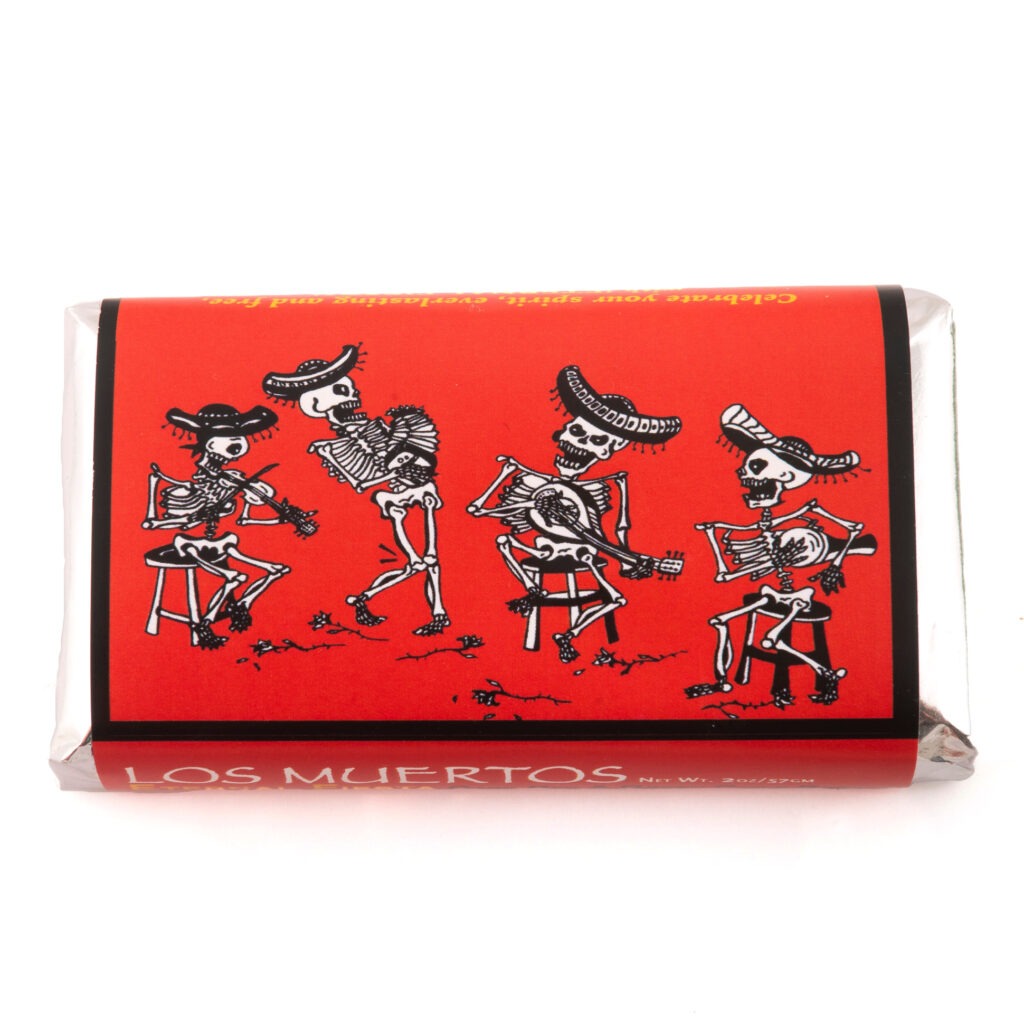 Hand-poured Los Muertos candy bars, featuring Day of the Dead imagery by artist Stacey Sullivan de Maldonado. 2oz each.