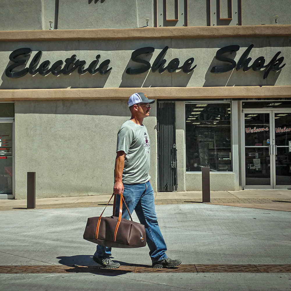 Thick leather with heavy duty straps. One big zipper on top to keep it all secure. This is a simple bag that likes to explore. Large enough for 2 pairs of shoes, shaving kit, clothes, binoculars, firearm/ammo, and any other fun things you might need.