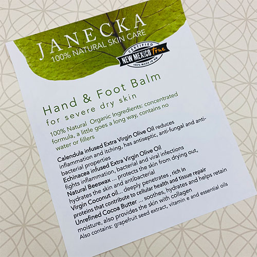 Hand and Foot Balm is 100% natural, with organic herbs and essential oils blended together for severely dry, cracked hands and feet. Also, excellent for eczema and psoriasis. Concentrated formula, not diluted with water, synthetic thickeners and emulsifiers or other irritating or toxic ingredients. It is also unscented. Available in 2 oz jar and travel size roll up stick, starting at $16 for the travel size.