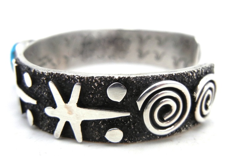 Sanchez’s signature sterling silver petroglyph patterns in this